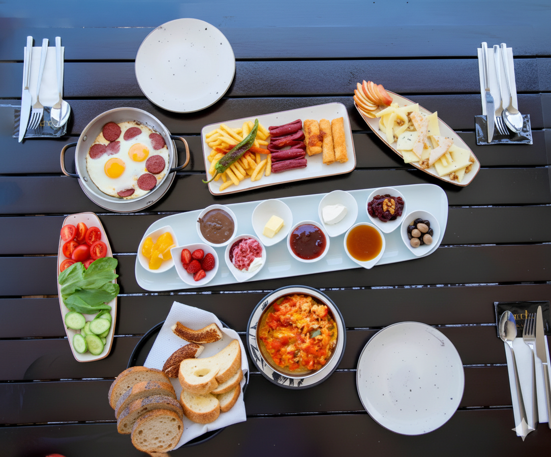 Zeytin, domates, salatalık, bal, kaymak, tereyağı, reçeller, nutella, tahin, pekmez, acuka, ezine peynir, taze kaşar peynir, çeçil peynir, eski kaşar, patates, kızarmış biber, sosis, sucuklu yumurta, kahvaltı çayları ile...