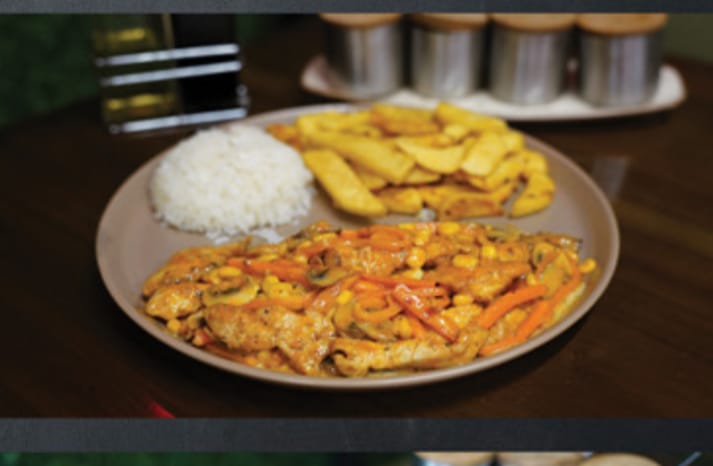 İçerik: tavuk göğsü kültür mantarı renkli biberler pilav ve patates ile |
