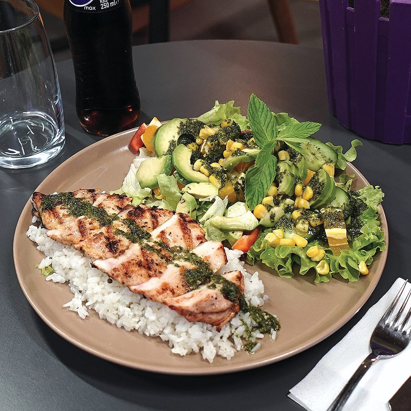 İçerik: tavuk göğsü pilav avakado portakal iceberg salatalık renkli biberler tane mısır cuban sos ile |