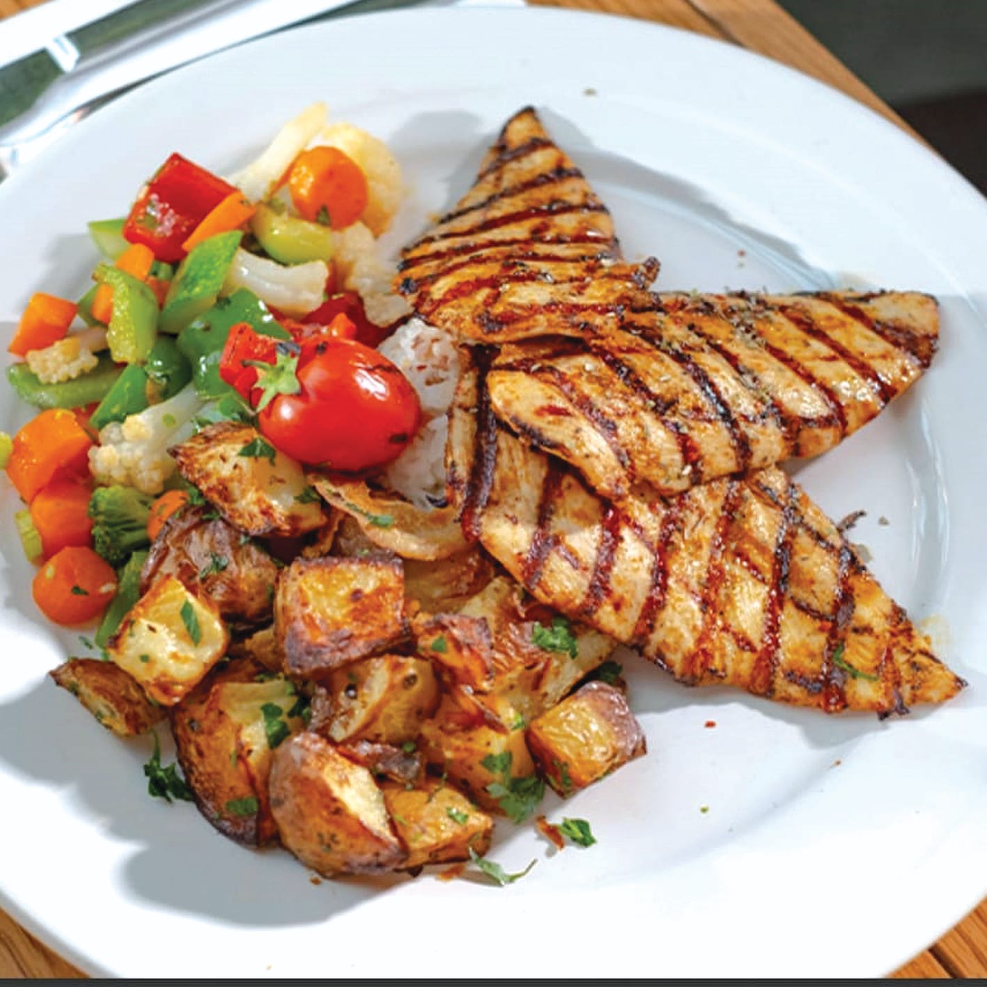 İçerik: tavuk göğsü fırın patates sebze garnitür pilav ile |