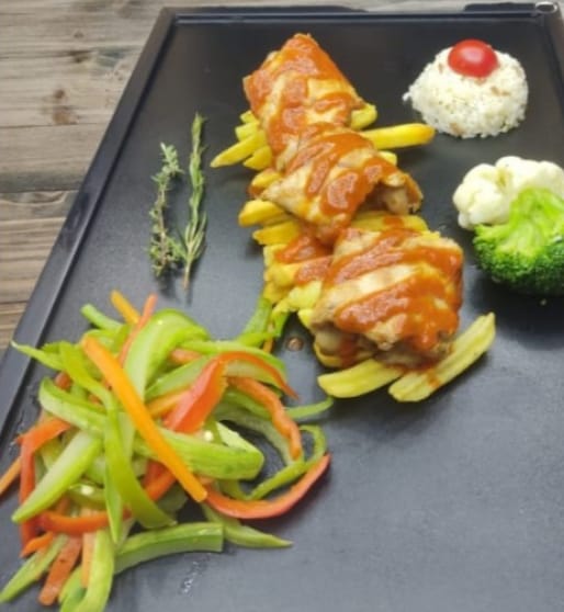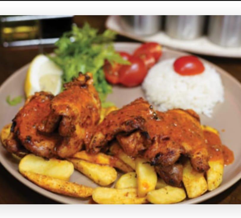 İçerik: tavuk sarma parmak patates boğaz patlıcan ve peri peri sos ile |