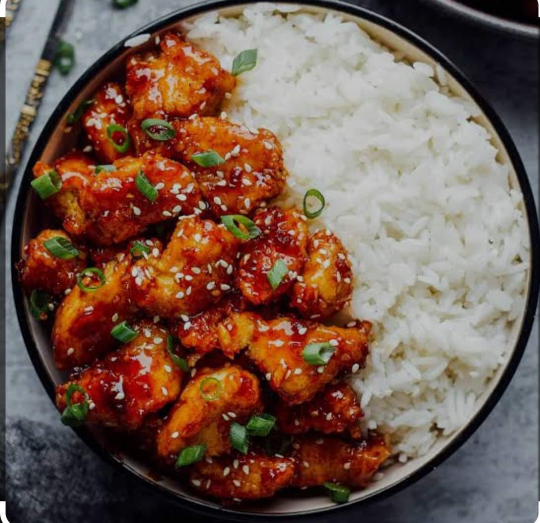 İçerik: pane edilmiş tavuk göğsü pilav kereviz kişniş susam susam yağı taze soğan sweet chili sos ile |